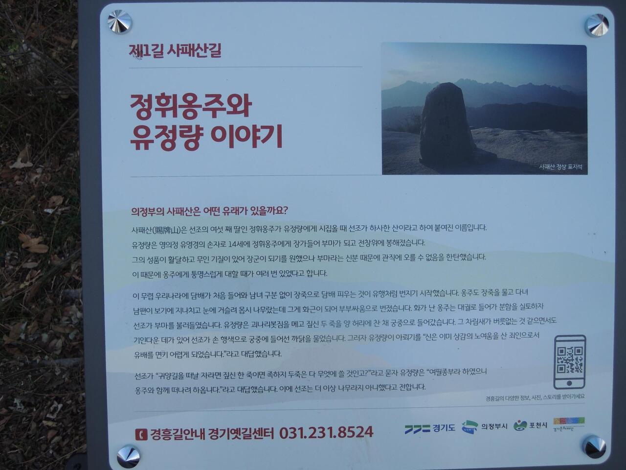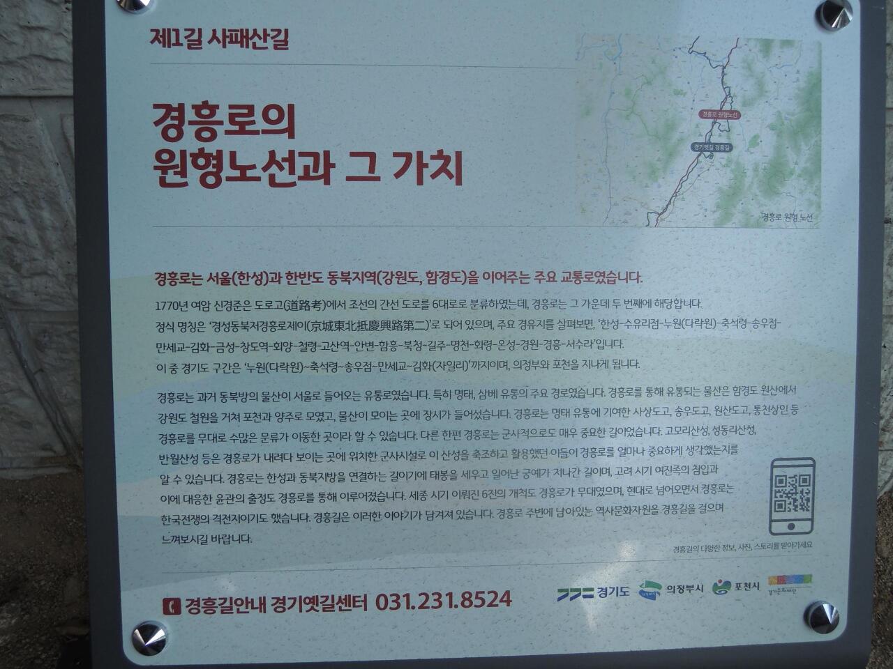 관북으로 가는 경흥길의 첫 관문사패산길은 서울에서 경기도로 넘어오는 첫 관문입니다. 사패산은 도봉산과 함께 북한산국립공원에 포함되어 있으며, 조선 선조의 여섯째 딸인 정휘옹주가 류정량(柳廷亮, 1591~1663)에게 시집갈 때 선조가 하사한 산이라 하여 붙은 이름입니다. 한동안 군사 보호구역으로 묶여 있어 일반인의 출입이 자유롭지 못했기 때문에 자연이 잘 보호되어 있는 곳입니다. 의정부는 숲이 울창하고 물이 깨끗하여 매력적인 곳이라는 것을 경흥길에서 느껴보시길 바랍니다.