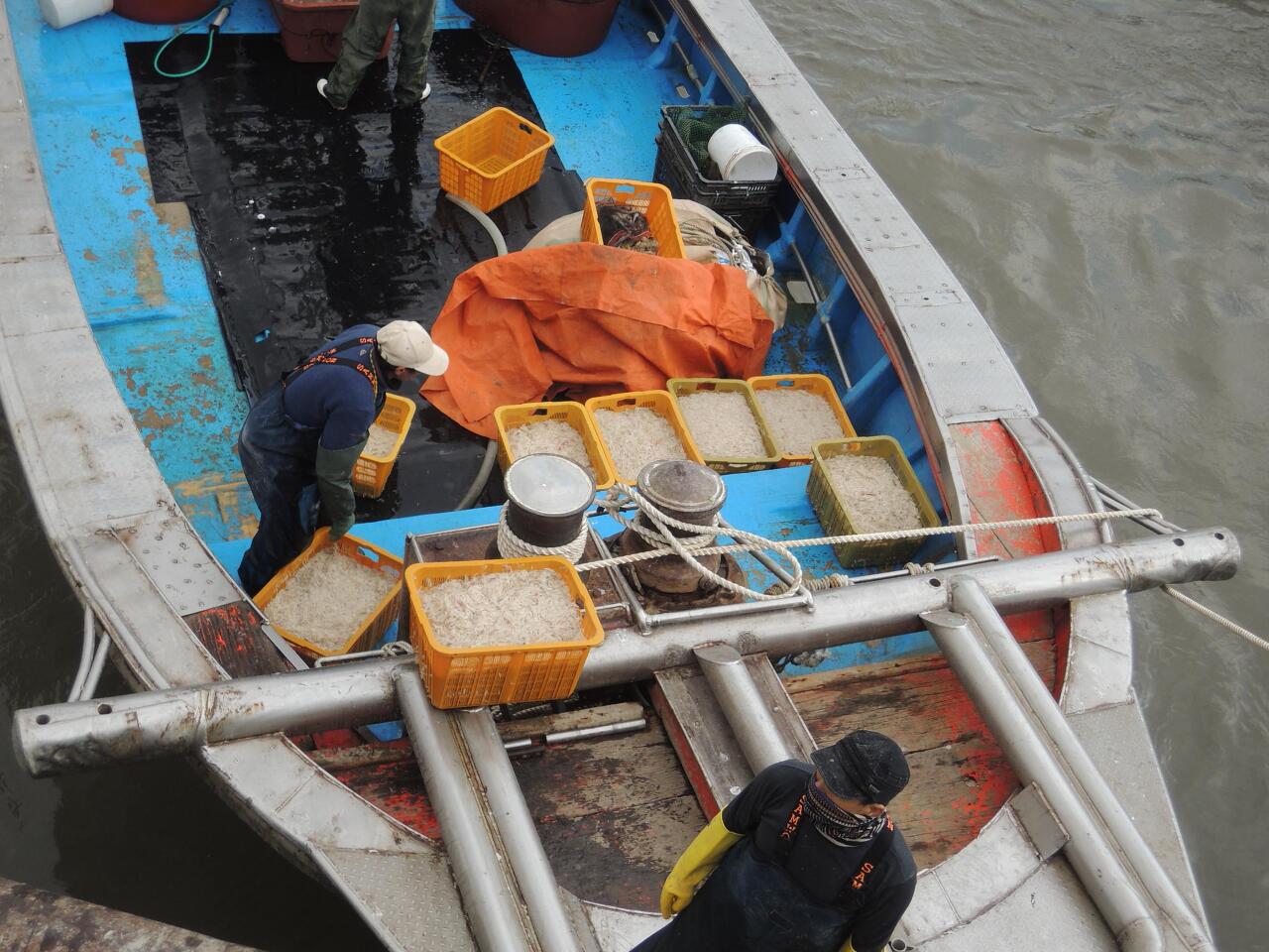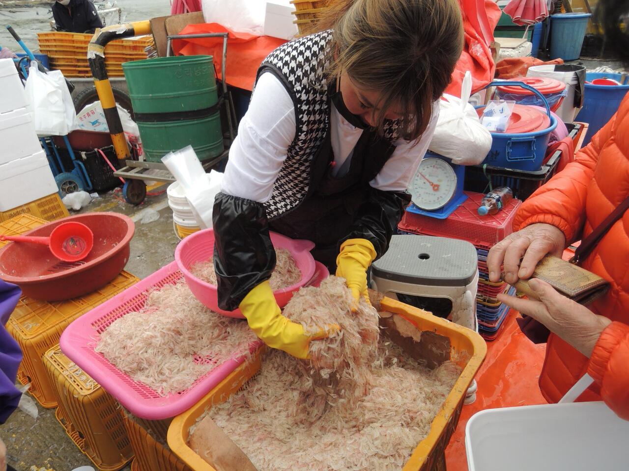 모습을 보는데 새우도 있다는 소식을 듣고 하선하는 장소로 가서 젓갈 대신 생 새우에 소금간을 해서 한말에
