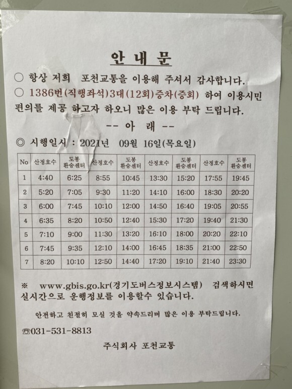 환승해야 좋은지 살펴보고 도봉산역 환승센터에서 09시30분 출발하는 1386번 버스를 이용해 한시간 만에 포천