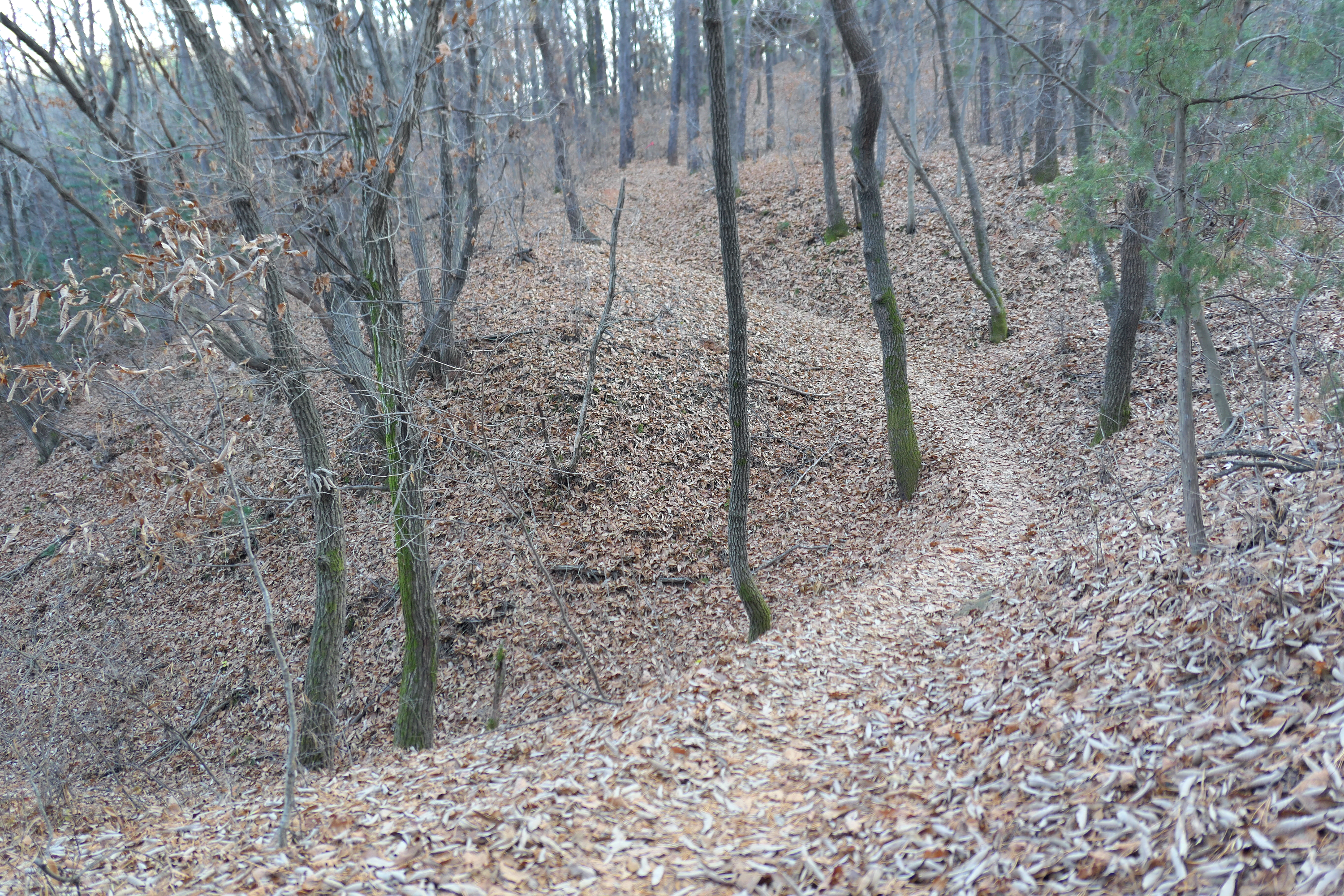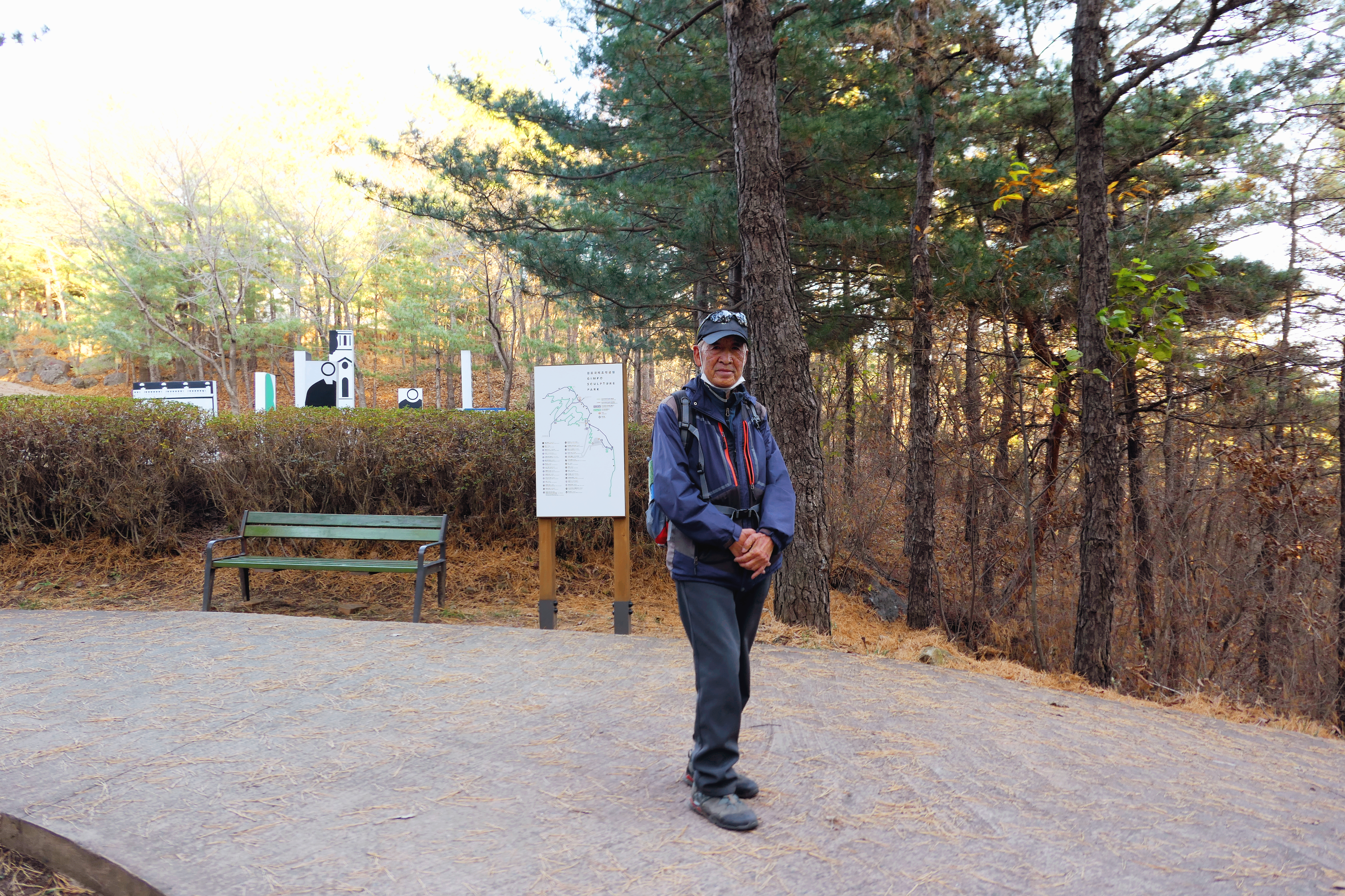시작해 구름다리 지나면 김포대학도 나무 사이로 보이고 낙엽이 쌓인 한적한 숲길로 가면 김포국제조각공원에 도착