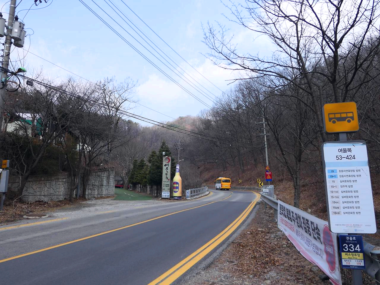숲길에 인접한 여울목 정류장에서 하차후 장흥숲길 1코스로 진입해서 겨울인지 봄인지 모를 정도인